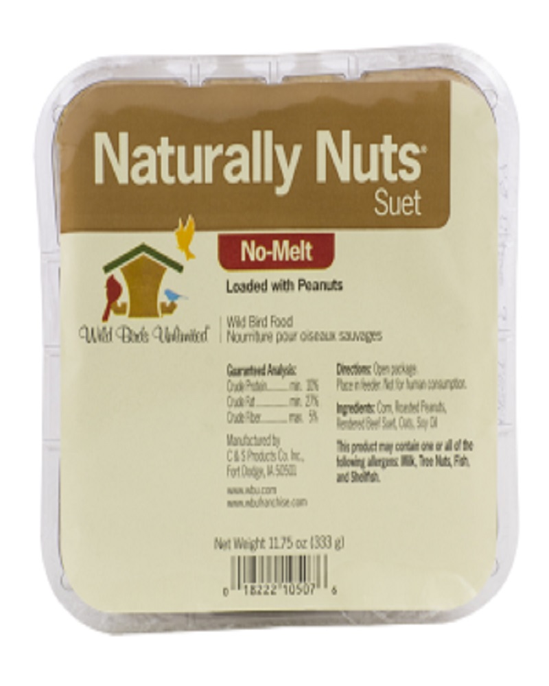 Our Naturally Nuts(R) no-melt suet Stackable(TM) is made of peanuts, rendered beef suet, corn and oats and an easy way to a high-energy, high-fat food to clinging and perching birds. Includes a hole down the center of the food that slides onto our seed cylinder feeders. Perfect for perching birds as well as clinging birds. No-melt suet is designed not to melt in temperatures up to 130? F.